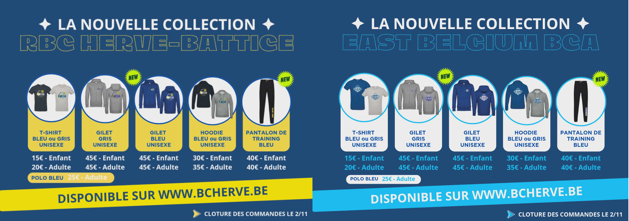 Comme l'année passée, la collection entière est déclinable avec le logo du RBC Herve-Battice ou de East Belgium BCA 💕
